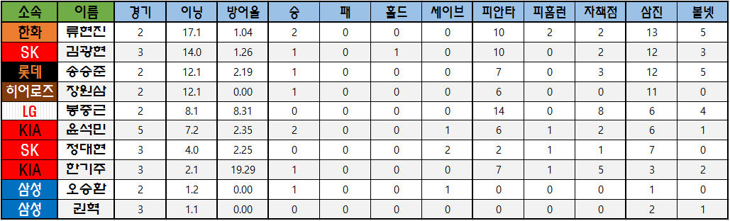| 소속 | 이름 | 경기 | 이닝 | 방어율 | 승 | 패 | 홀드 | 세이브 | 피안타 | 피홈런 | 자책점 | 삼진 | 볼넷 |