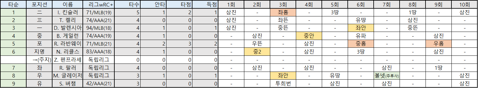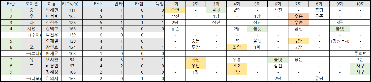 | 타순 | 포지션 | 이름 | 리그wRC+ | 타수 | 안타 | 타점 | 득점 |