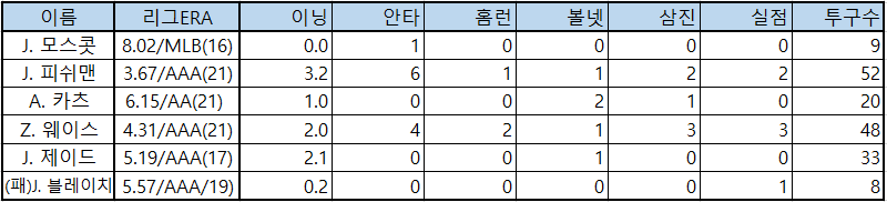 | J. 모스콧 | 8.02/MLB(16) | 0.0 | 1 | 0 | 0 | 0 | 0 | 9 |
