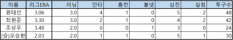 | 최원준 | 3.30 | 3.0 | 2 | 1 | 0 | 4 | 2 | 42 |