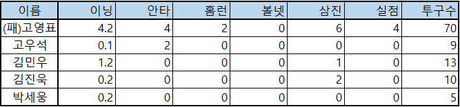 | 이름 | 이닝 | 안타 | 홈런 | 볼넷 | 삼진 | 실점 | 투구수 |