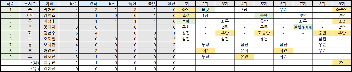 | 타순 | 포지션 | 이름 | 타수 | 안타 | 타점 | 득점 | 볼넷 | 삼진 |