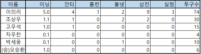 | 이름 | 이닝 | 안타 | 홈런 | 볼넷 | 삼진 | 실점 | 투구수 |