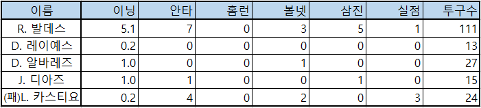 | (패)L. 카스티요 | 0.2 | 4 | 0 | 2 | 0 | 3 | 24 |