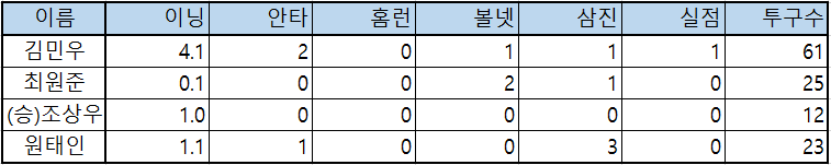 | 이름 | 이닝 | 안타 | 홈런 | 볼넷 | 삼진 | 실점 | 투구수 |