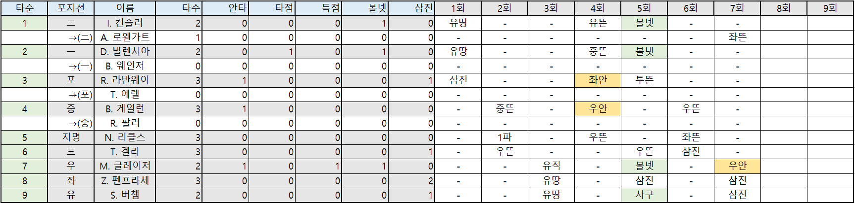 | 타순 | 포지션 | 이름 | 타수 | 안타 | 타점 | 득점 | 볼넷 | 삼진 |