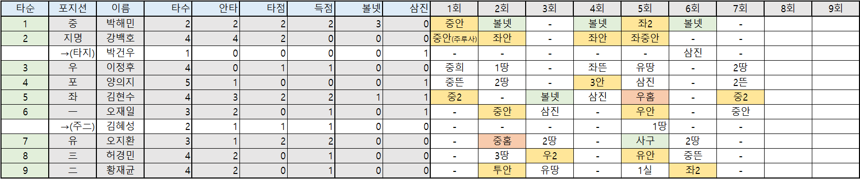 | 타순 | 포지션 | 이름 | 타수 | 안타 | 타점 | 득점 | 볼넷 | 삼진 |
