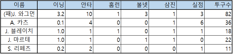 | 이름 | 이닝 | 안타 | 홈런 | 볼넷 | 삼진 | 실점 | 투구수 |
