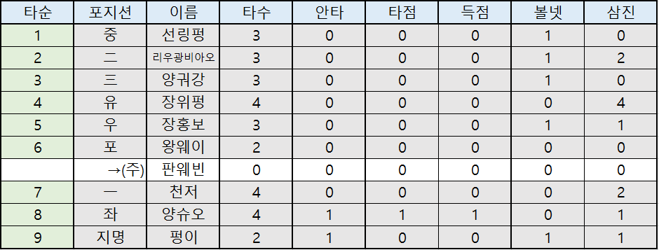 타순 | 포지션 | 이름 | 타수 | 안타 | 타점 | 득점 | 볼넷 | 삼진 |