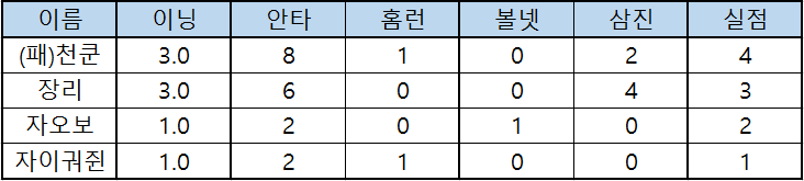 | 이름 | 이닝 | 안타 | 홈런 | 볼넷 | 삼진 | 실점 |