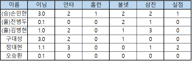 | (승)손민한 | 3.0 | 2 | 1 | 2 | 2 | 1 |