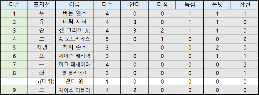 | 3 | 중 | 켄 그리피 Jr. | 4 | 3 | 2 | 1 | 1 | 0 |