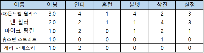 | 이름 | 이닝 | 안타 | 홈런 | 볼넷 | 삼진 | 실점 |