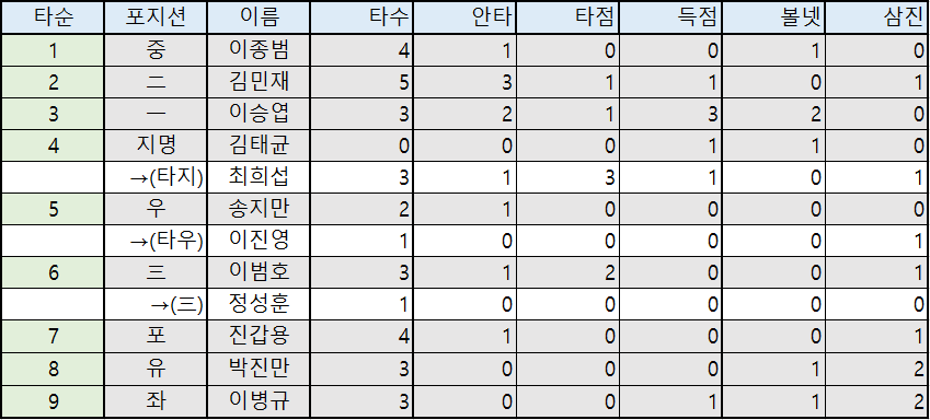 | 타순 | 포지션 | 이름 | 타수 | 안타 | 타점 | 득점 | 볼넷 | 삼진 |