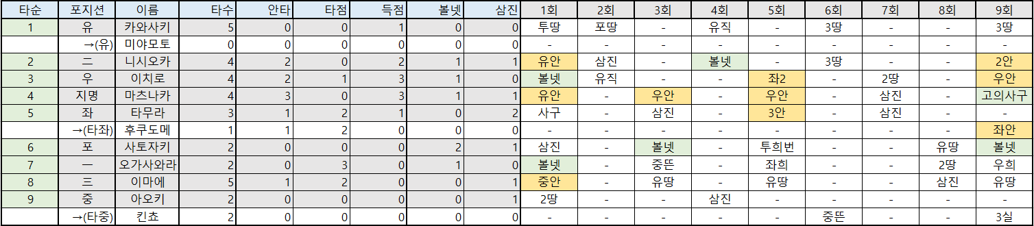 5 | 좌 | 타무라 | 3 | 1 | 2 | 1 | 0 | 2 |