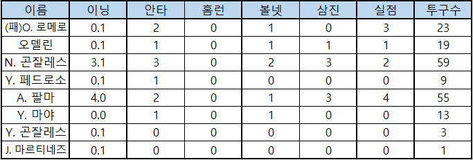 | 이름 | 이닝 | 안타 | 홈런 | 볼넷 | 삼진 | 실점 | 투구수 |