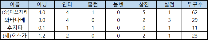 (승)마쓰자카 | 4.0 | 4 | 1 | 0 | 5 | 1 | 62 |