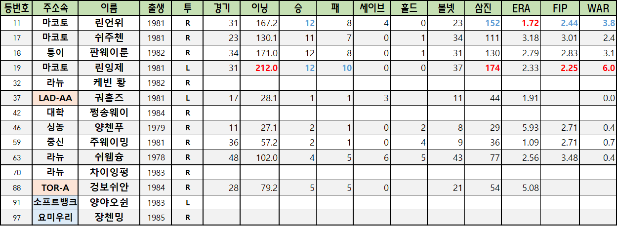| 11 | 마코토 | 린언위 | 1981 | R | 31 | 167.2 | 12 | 8 | 4 | 0 | 23 | 152 | 1.72 | 2.44 | 3.8 |