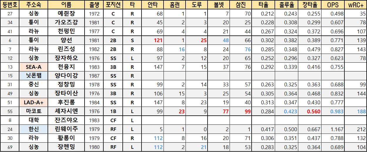 | 31 | 중신 | 정창밍 | 1978 | SS | R | 99 | 2 | 14 | 33 | 57 | 0.263 | 0.325 | 0.363 | 0.688 | 99 |