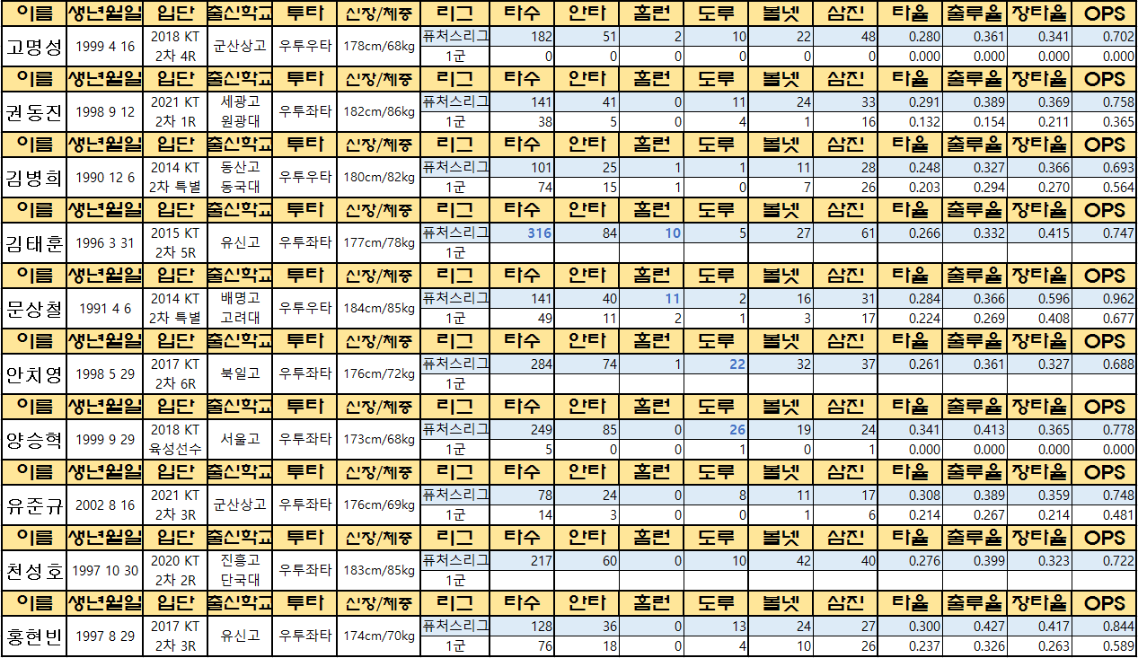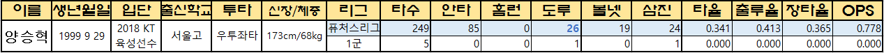 | 이름 | 생년월일 | 입단 | 출신학교 | 투타 | 신장/체중 | 리그 | 타수 | 안타 | 홈런 | 도루 | 볼넷 | 삼진 | 타율 | 출루율 | 장타율 | OPS |
