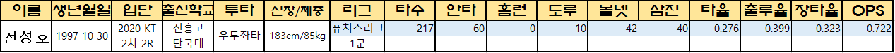 | 천성호 | 1997 10 30 | 2020 KT 2차 2R |