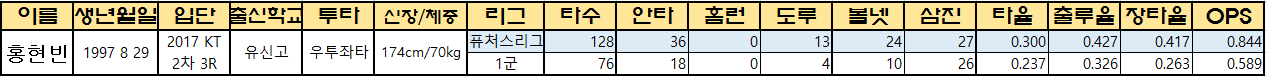 북일고 | 우투좌타 | 176cm/72kg | 퓨처스리그 | 284 | 74 | 1 | 22 | 32 | 37 | 0.261 | 0.361 | 0.327 | 0.688 |