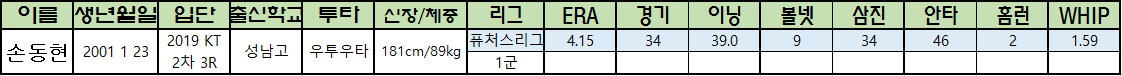 | 손동현 | 2001 1 23 | 2019 KT 2차 3R |