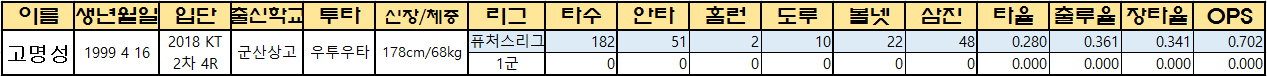 | 고명성 | 1999 4 16 | 2018 KT 2차 4R |
