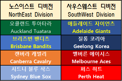 호주리그는 8개의 팀을 2개의 디비전 (노스이스트, 사우스웨스트) 으로 나누어 40경기를 치룹니다.