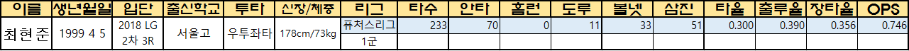| 최현준 | 1999 4 5 | 2018 LG 2차 3R |