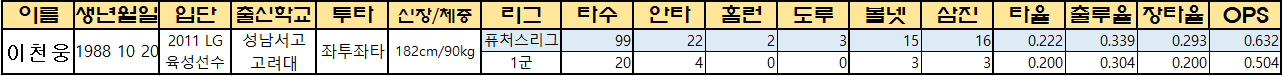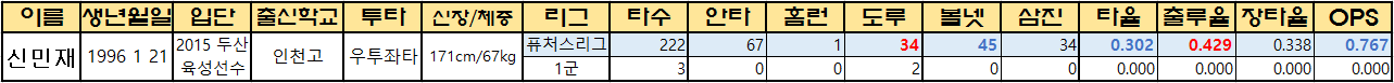 | 이름 | 생년월일 | 입단 | 출신학교 | 투타 | 신장/체중 | 리그 | 타수 | 안타 | 홈런 | 도루 | 볼넷 | 삼진 | 타율 | 출루율 | 장타율 | OPS |