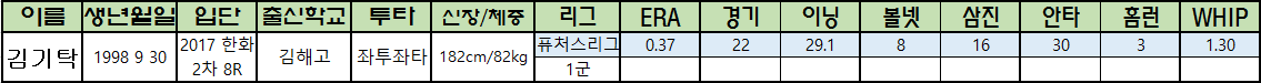 | 김기탁 | 1998 9 30 | 2017 한화 2차 8R | 김해고 | 좌투좌타 | 182cm/82kg | 퓨처스리그 | 0.37 | 22 | 29.1 | 8 | 16 | 30 | 3 | 1.30 |