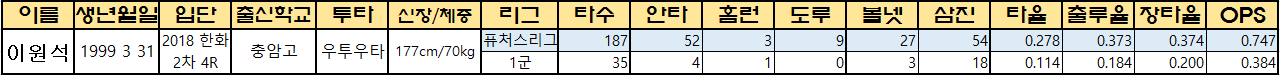 | 이원석 | 1999 3 31 | 2018 한화 2차 4R | 충암고 | 우투우타 | 177cm/70kg | 퓨처스리그 | 187 | 52 | 3 | 9 | 27 | 54 | 0.278 | 0.373 | 0.374 | 0.747 |