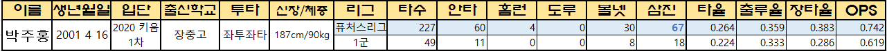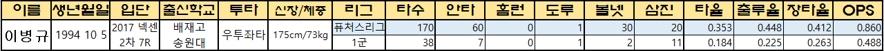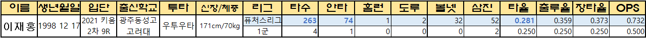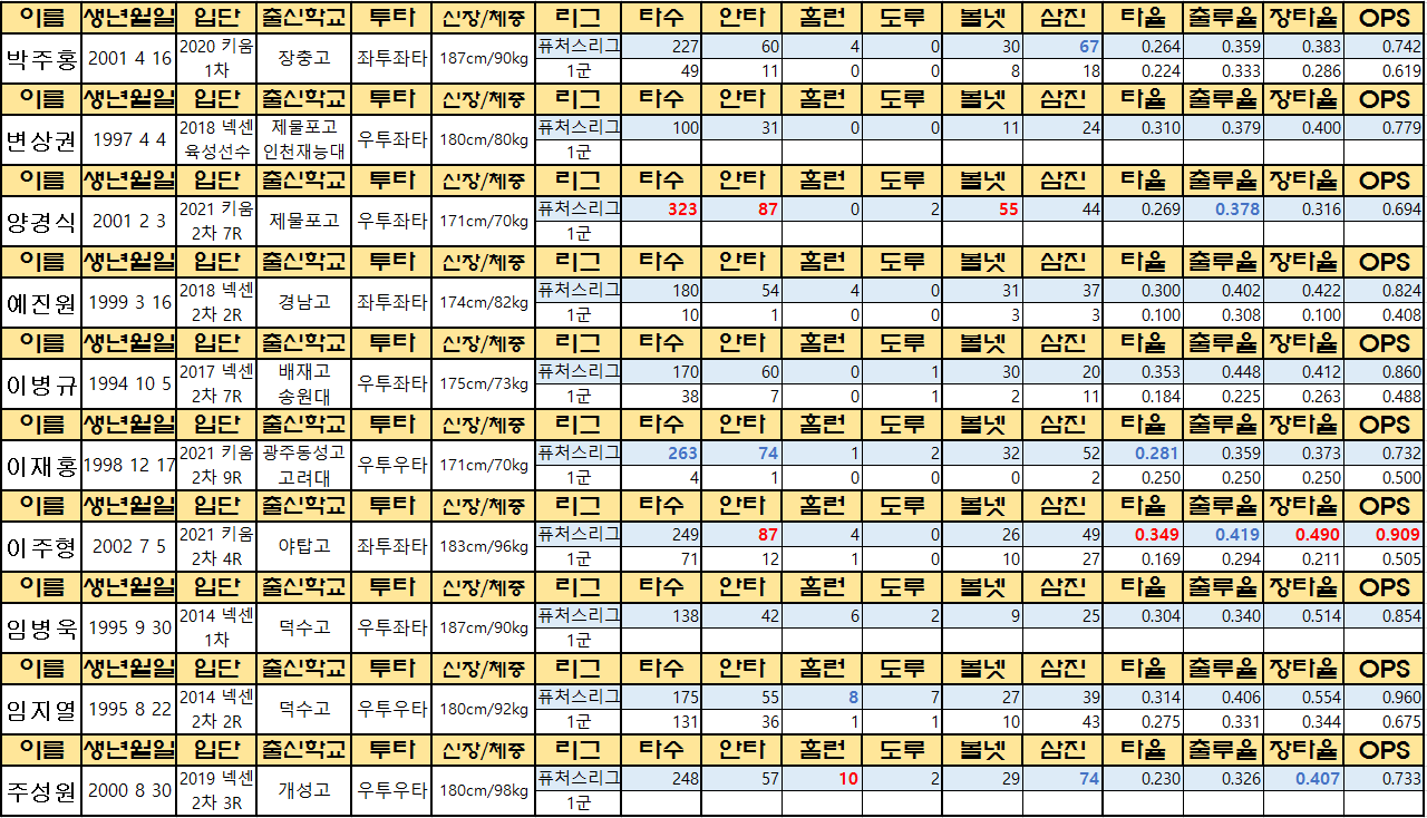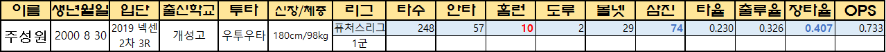 개성고 | 우투우타 | 180cm/98kg | 퓨처스리그 | 248 | 57 | 10 | 2 | 29 | 74 | 0.230 | 0.326 | 0.407 | 0.733 |