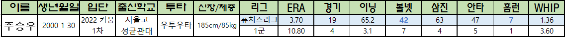 전주고 | 우투우타 | 187cm/91kg | 퓨처스리그 | 2.92 | 9 | 12.1 | 12 | 13 | 11 | 0 | 1.86 |