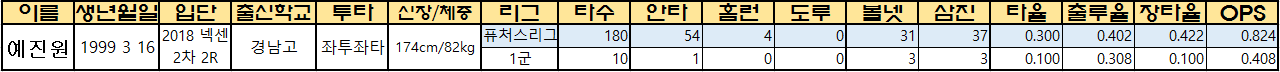 경남고 | 좌투좌타 | 174cm/82kg | 퓨처스리그 | 180 | 54 | 4 | 0 | 31 | 37 | 0.300 | 0.402 | 0.422 | 0.824 |