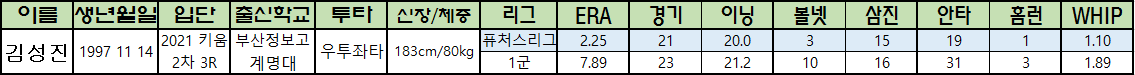 | 김성진 | 1997 11 14 | 2021 키움 2차 3R |