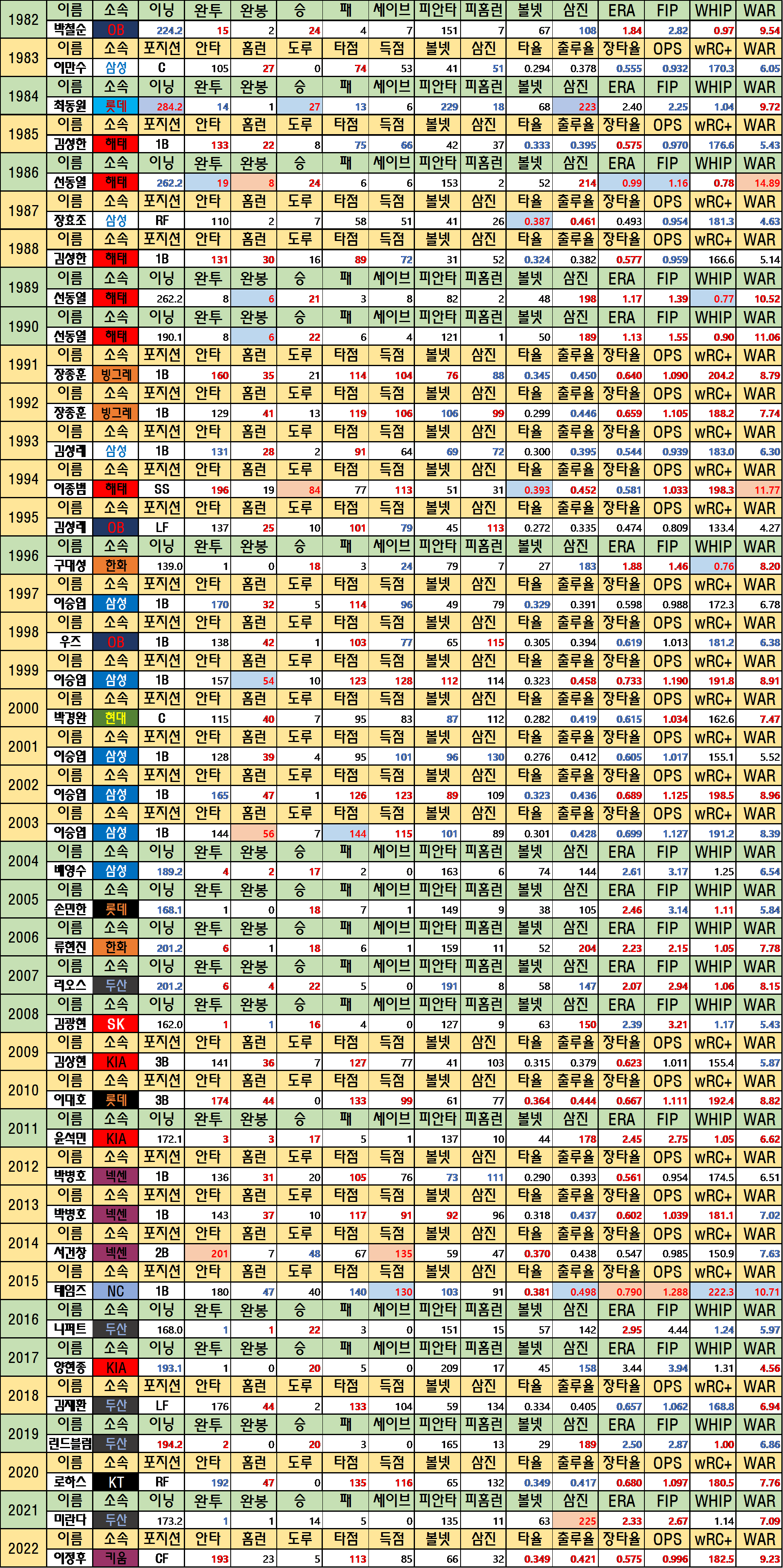 빨간 바탕은 역대 1위, 파란 바탕은 역대 3위 이내의 기록입니다.