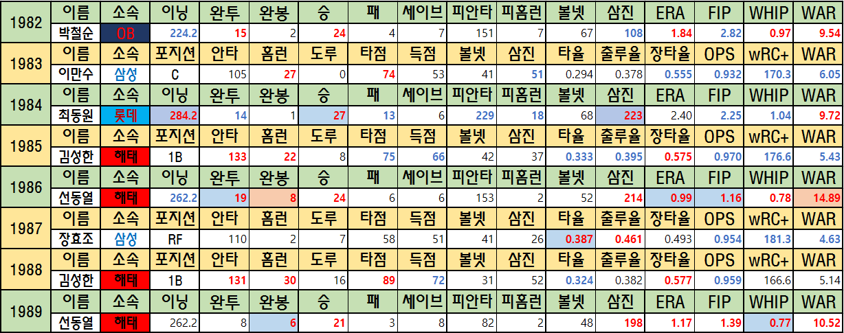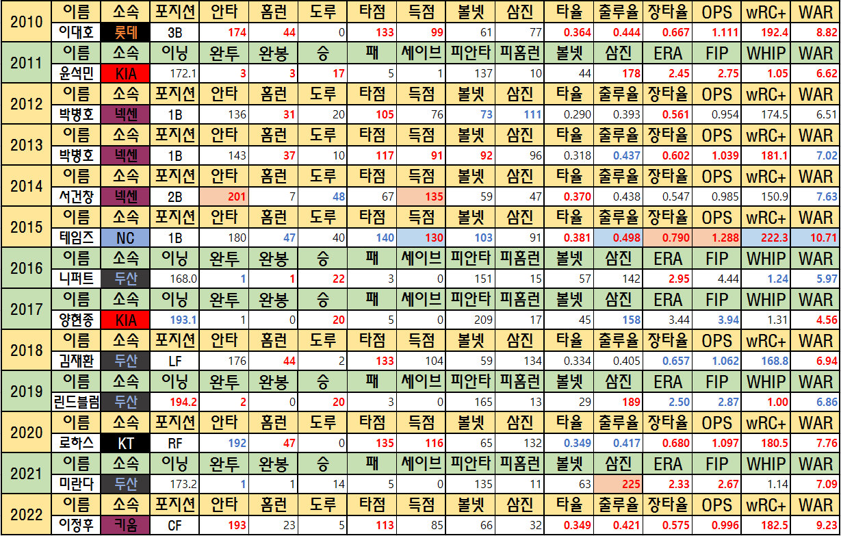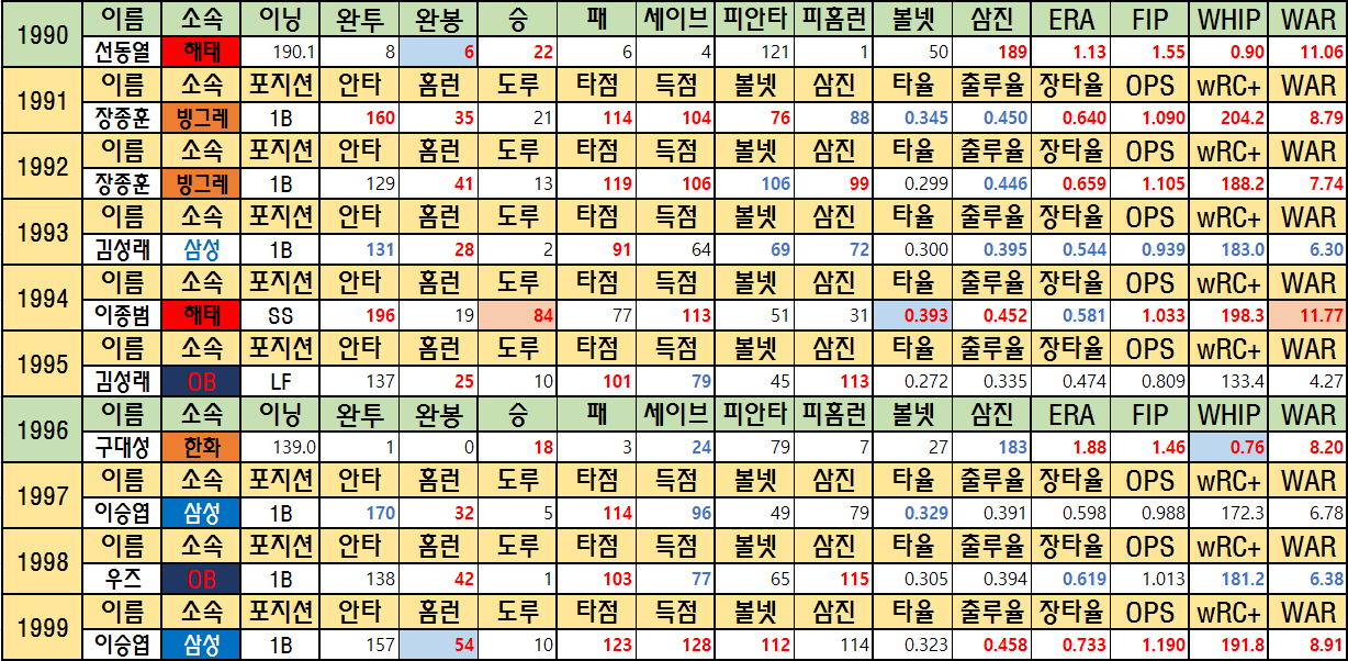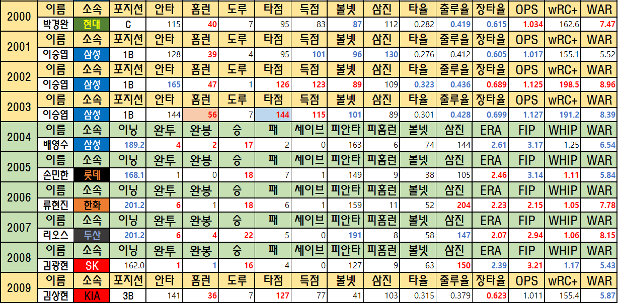 오늘은 정규시즌의 MVP들을 정리해보려 합니다. 빨간 글씨는 해당시즌 1위인 기록입니다. 앞으로 KBO에 적을 sWAR(스탯티즈 기준 WAR)은 WAR로 줄여 적겠습니다. 글이 길어져 2000년 전 후 둘로 나누어