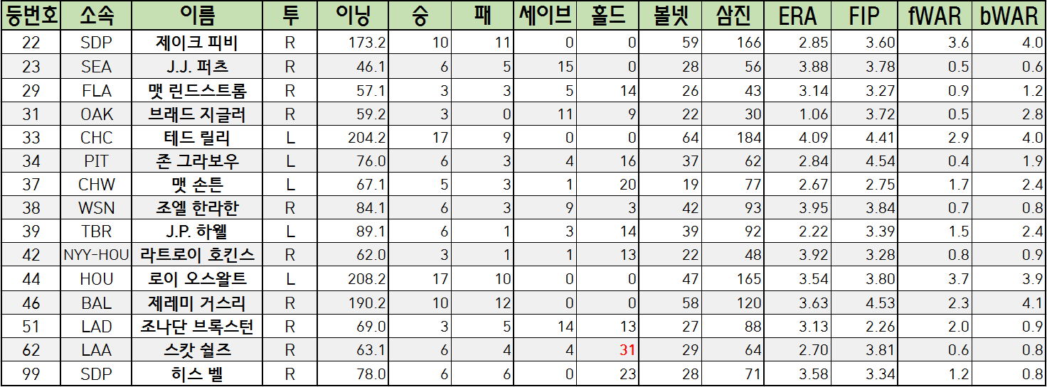 | 22 | SDP | 제이크 피비 | R | 173.2 | 10 | 11 | 0 | 0 | 59 | 166 | 2.85 | 3.60 | 3.6 | 4.0 |