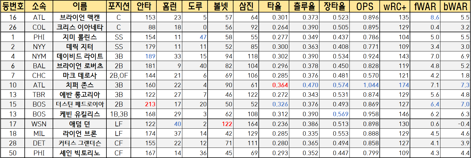| 등번호 | 소속 | 이름 | 포지션 | 안타 | 홈런 | 도루 | 볼넷 | 삼진 | 타율 | 출루율 | 장타율 | OPS | wRC+ | fWAR | bWAR |