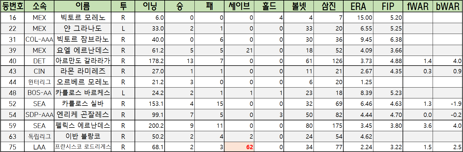 | 52 | SEA | 카를로스 실바 | R | 153.1 | 4 | 15 | 0 | 0 | 32 | 69 | 6.46 | 4.63 | 1.3 | -1.9 |