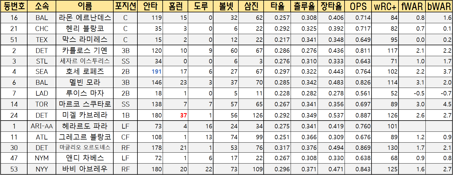 | 등번호 | 소속 | 이름 | 포지션 | 안타 | 홈런 | 도루 | 볼넷 | 삼진 | 타율 | 출루율 | 장타율 | OPS | wRC+ | fWAR | bWAR |