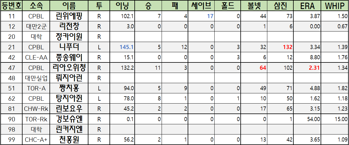 | 47 | CPBL | 리아오위청 | R | 132.2 | 11 | 3 | 0 | 0 | 64 | 102 | 2.31 | 1.34 |