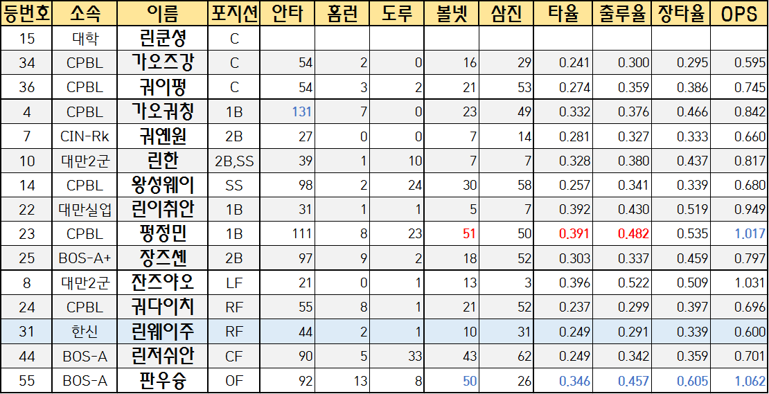 | 10 | 대만2군 | 린한 | 2B,SS | 39 | 1 | 10 | 7 | 7 | 0.328 | 0.380 | 0.437 | 0.817 |