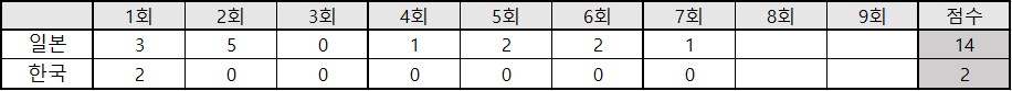 | 6 | 一 | 우치카와 | 3 | 1 | 2 | 0 | 1 | 0 |