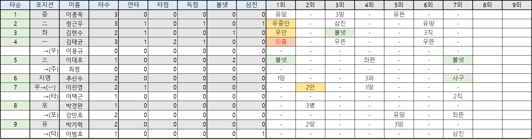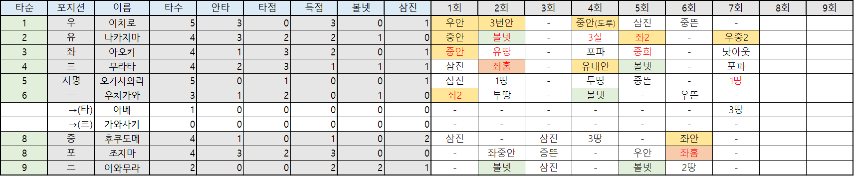 | 타순 | 포지션 | 이름 | 타수 | 안타 | 타점 | 득점 | 볼넷 | 삼진 |