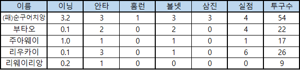 | 이름 | 이닝 | 안타 | 홈런 | 볼넷 | 삼진 | 실점 | 투구수 |
