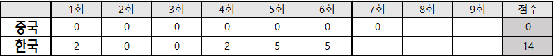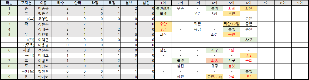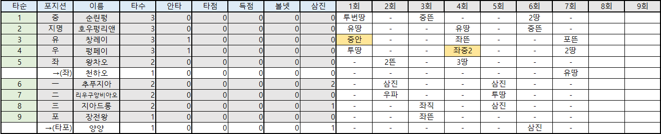 | 타순 | 포지션 | 이름 | 타수 | 안타 | 타점 | 득점 | 볼넷 | 삼진 |