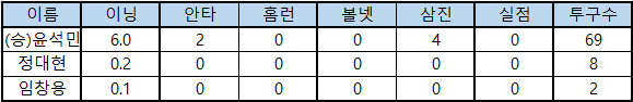 | (승)윤석민 | 6.0 | 2 | 0 | 0 | 4 | 0 | 69 |